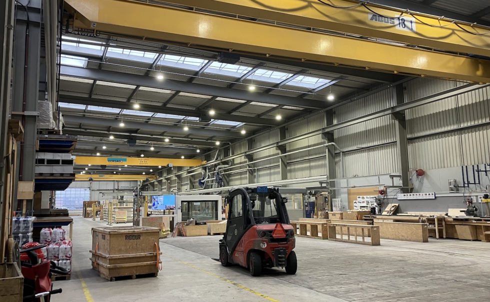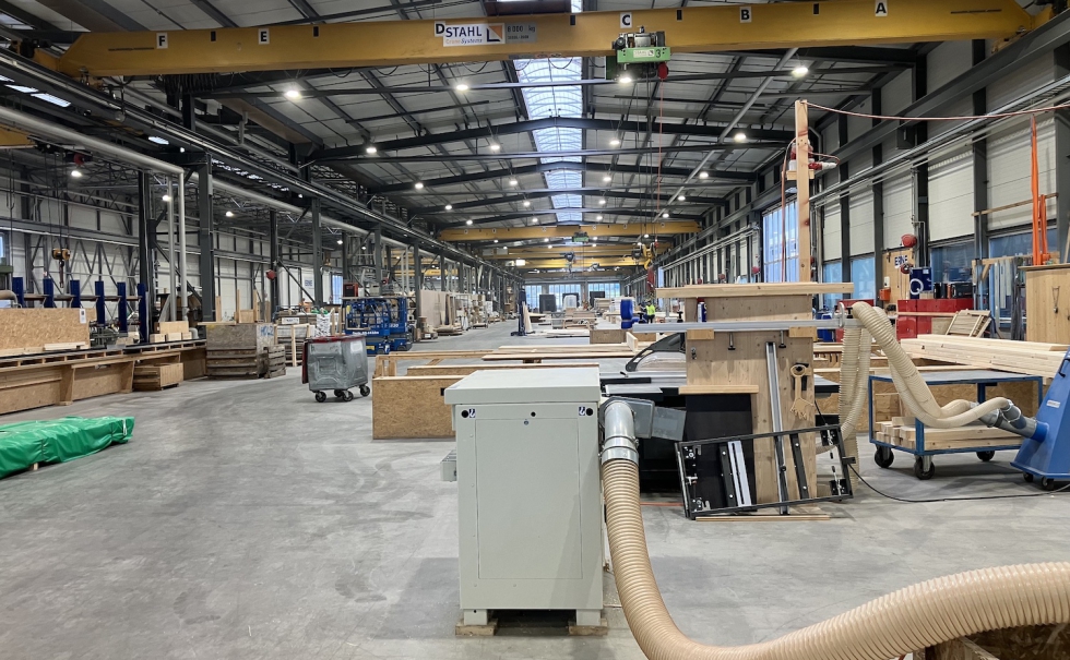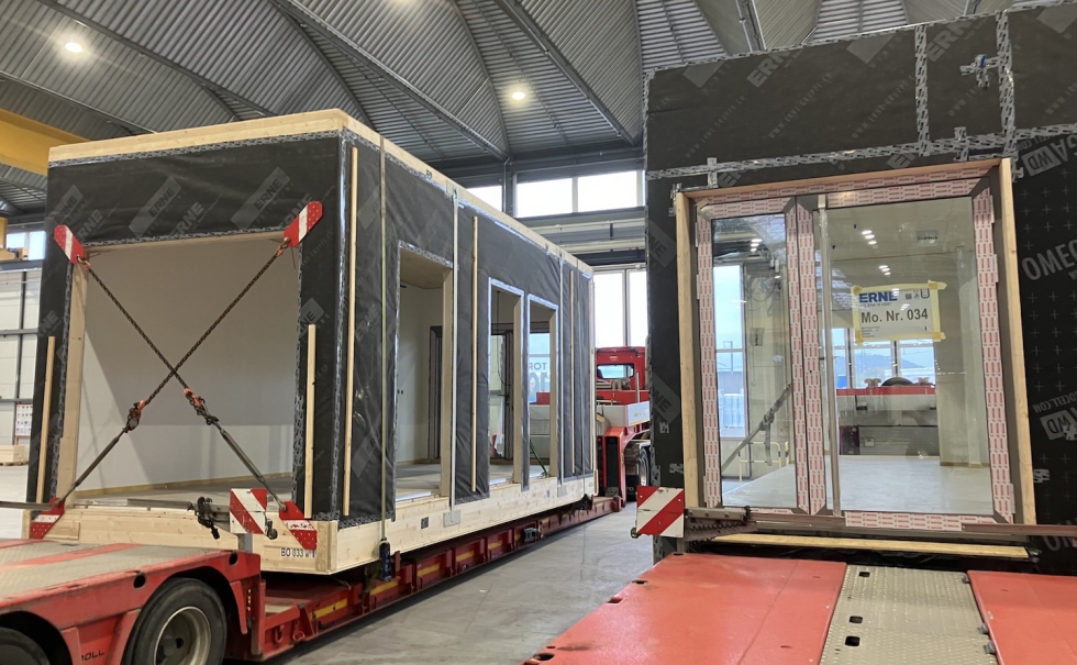 本社社屋に入ると、まず目に飛び込んできたのは版築壁がふんだんに使用されていることでした。オフィスデザインも木を生かした斬新なもので、日本のオフィスとは全く異なる雰囲気に圧倒されました。事業全般の説明は、広報担当者ではなく急遽CEO自らが行ってくださりました。同社の最大の特徴は、構造パネルや外壁パネルなどの生産ラインをロボット化することで、作業効率を格段に向上させていることだといいます。特にロボットの作業レベルは想像をはるかに超えるもので、まるで職人の手仕事のような精密さでした。社屋内装に使われている天井の装飾部材や版築壁もロボットによって製造・製品化されており、日本の技術水準を大きく超える進化に驚かされました。