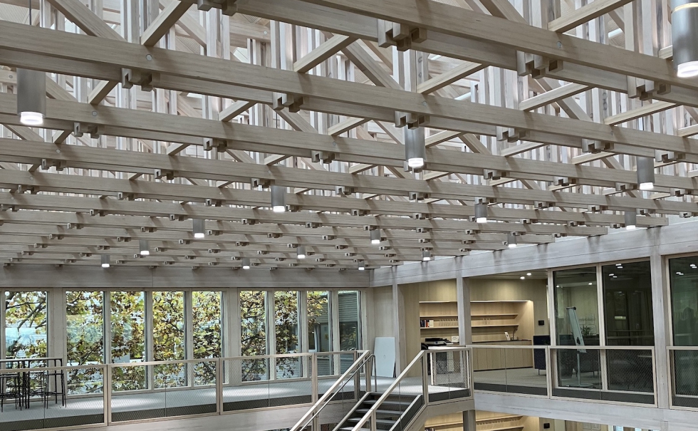 もうひとつ驚いたのは、社員の駐車場が木造ハイブリッド構造であることです。梁には強度の高いブナ材の集成梁が使われ、約12メートルの空間を支えています。上層階にはコンクリートスラブと車が駐車されており、かなりの重量を支えているにも関わらず、梁のたわみはわずか3 センチ程度。鉄骨の梁に匹敵する強度を持ち、実際に設置されている梁で燃焼実験や損傷実験を行うなど、スイスにおける木造建築の進化は想像をはるかに超えるものでした。