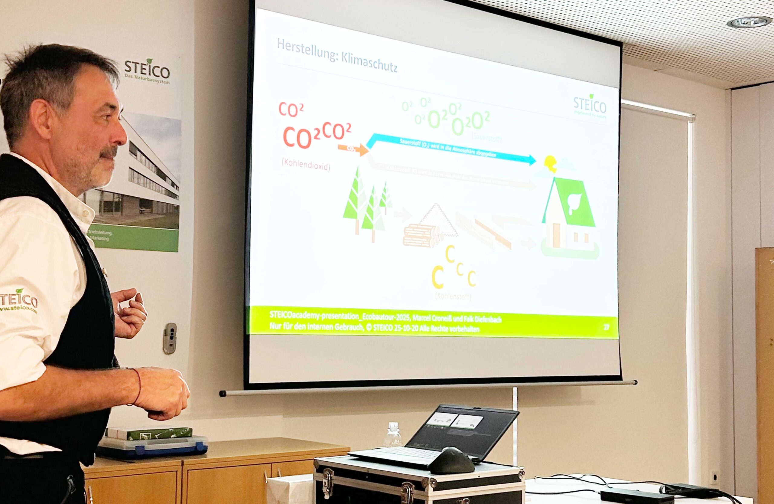 ミュンヘン空港からバスで約30分、最初の訪問先はSTEICO社です。日本では木質繊維断熱材メーカーとして知られていますが、LVL(単板積層材)など木から製造できる様々な建材を提供している企業です。木質繊維断熱材に対して、私が以前から気になっていたのは製造時CO2排出量です。カーボンニュートラル実現に向けて、世界各国で建築のLCA(ライフサイクルアセスメント)への関心が高まりつつあります。会社及び商品説明の際には、その点も数値として明示されていました。木材が成長する過程で貯蔵するCO2に対して生産時のCO2排出量はその1/3。改めて大変環境に良いことがわかりました(日本では、輸入による運搬のCO2排出量も加味する必要があります)。