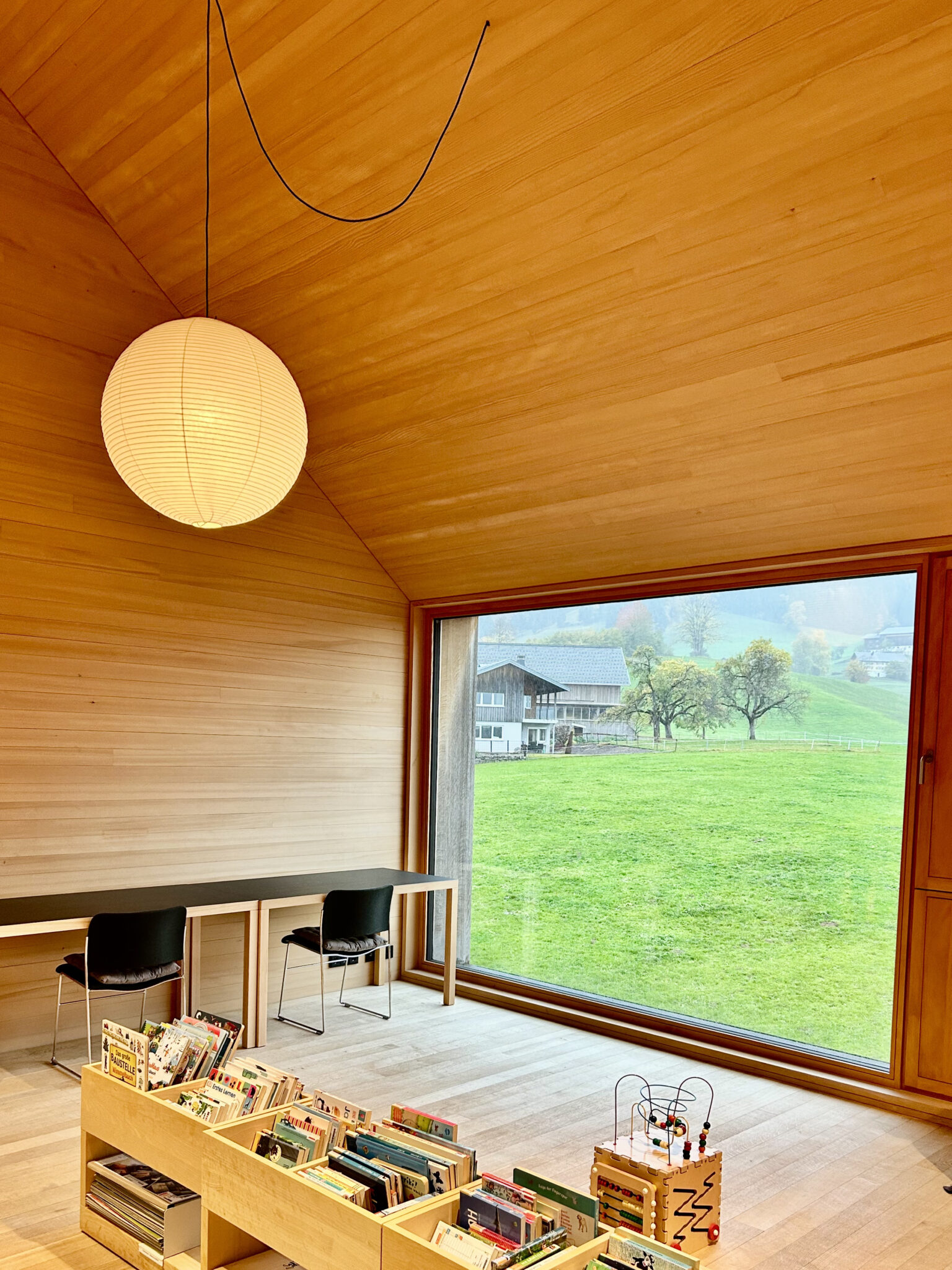 外壁には地域のモミやトウヒを採用し、内装にも木材を積極的に用いています。ローテクな環境戦略という点は、過剰な設備を避ける形で実現しています。換気については、ベースの換気システムと併用して、教室に設置されたCO2モニターが基準値を超えると教師に信号を送ることで窓開け換気を促し、CO2濃度が低下したら窓を閉めるよう促すシステムとなっています。