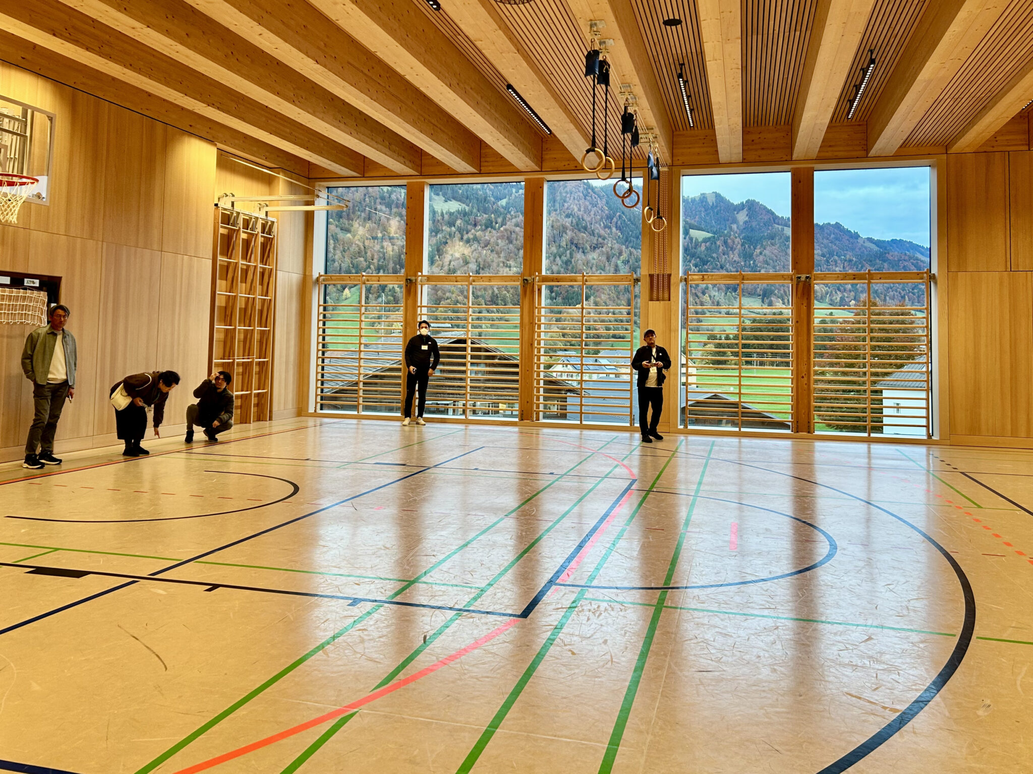 カウフマン氏と別れ、ヒッティサウ村の学校建築群の事例を見学。この事例では「地域産木材の積極的な使用」や「ローテクの環境戦略実施」などが条件となる設計コンペが行われ、実現されています。