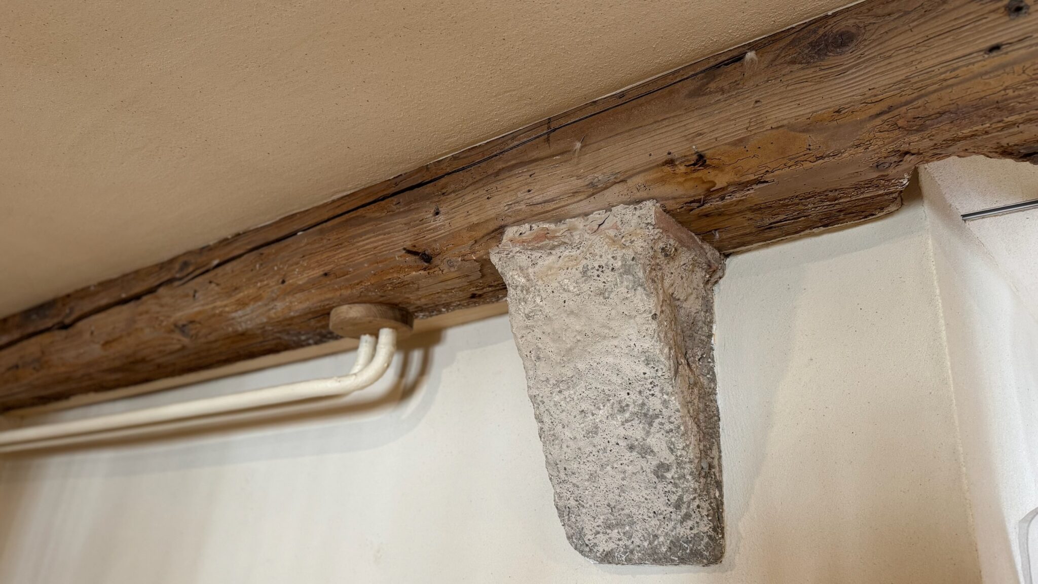 会社見学後は、HAGA社の製品を施工してお引き渡しをした住宅を見学させていただきました。見学先は川沿いに面した複数の住宅が長屋形式で建ち並んでいる中のひと区画で、建造されたのは1640年頃だそうです。川が近いことから湿気で傷んでいたため、内部は一度スケルトンにして改修されています。HAGA社の製品は透湿性に優れているため、このような現場にも適しています。外壁の断熱性能確保について、ここでは断熱・除湿性能を持つHAGA社の漆喰製品が室内側から施工されています。ここでは外断熱だと断熱厚みを十分に確保できないという理由で、内付加断熱という判断がされています。スイスでは景観上の理由から外断熱が難しい地域、あるいは外断熱ができない地域があります。