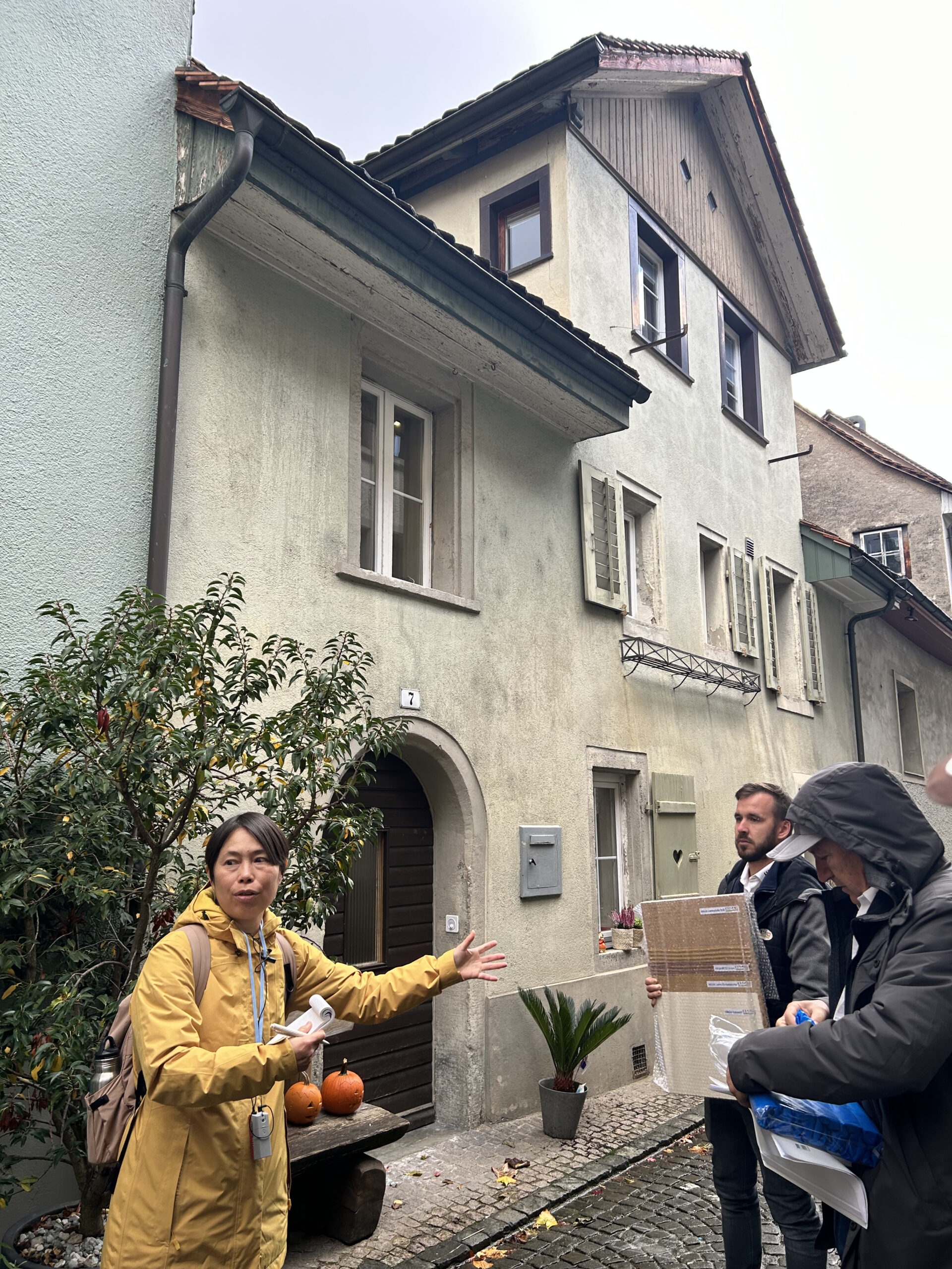 会社見学後は、HAGA社の製品を施工してお引き渡しをした住宅を見学させていただきました。見学先は川沿いに面した複数の住宅が長屋形式で建ち並んでいる中のひと区画で、建造されたのは1640年頃だそうです。川が近いことから湿気で傷んでいたため、内部は一度スケルトンにして改修されています。HAGA社の製品は透湿性に優れているため、このような現場にも適しています。外壁の断熱性能確保について、ここでは断熱・除湿性能を持つHAGA社の漆喰製品が室内側から施工されています。ここでは外断熱だと断熱厚みを十分に確保できないという理由で、内付加断熱という判断がされています。スイスでは景観上の理由から外断熱が難しい地域、あるいは外断熱ができない地域があります。