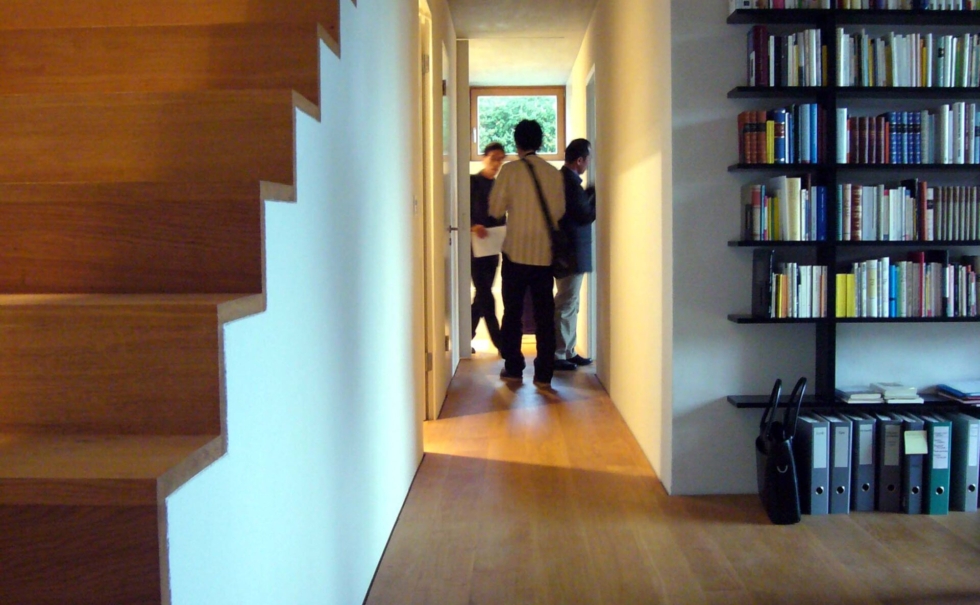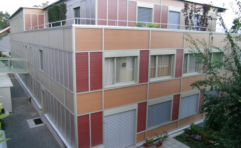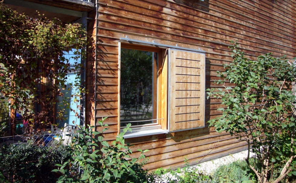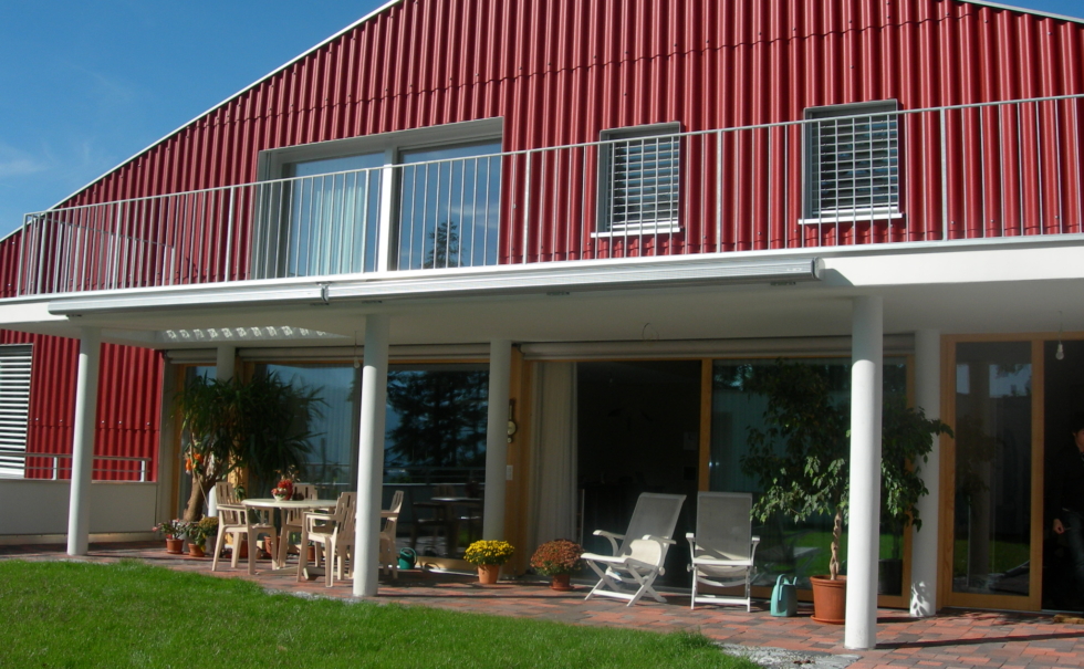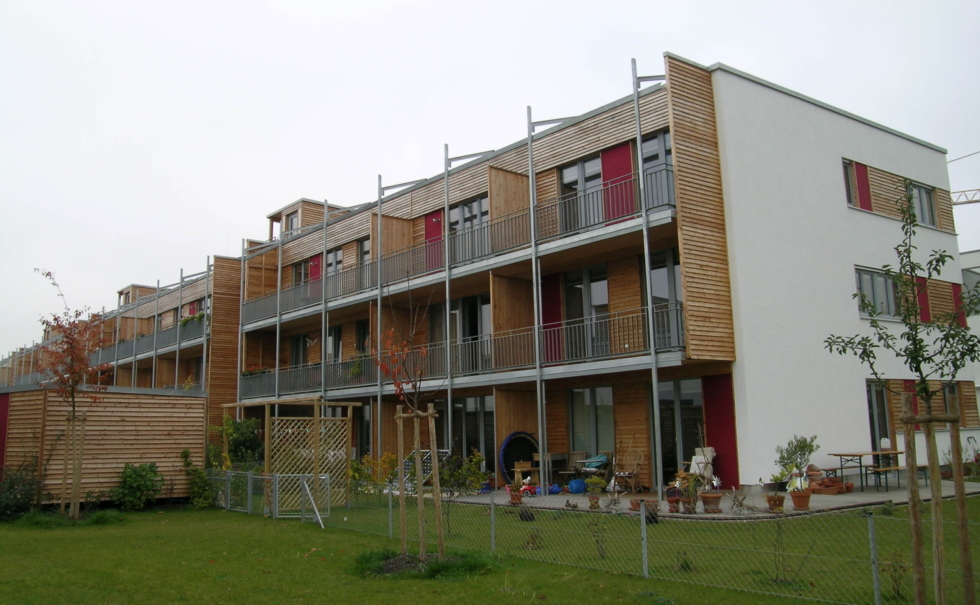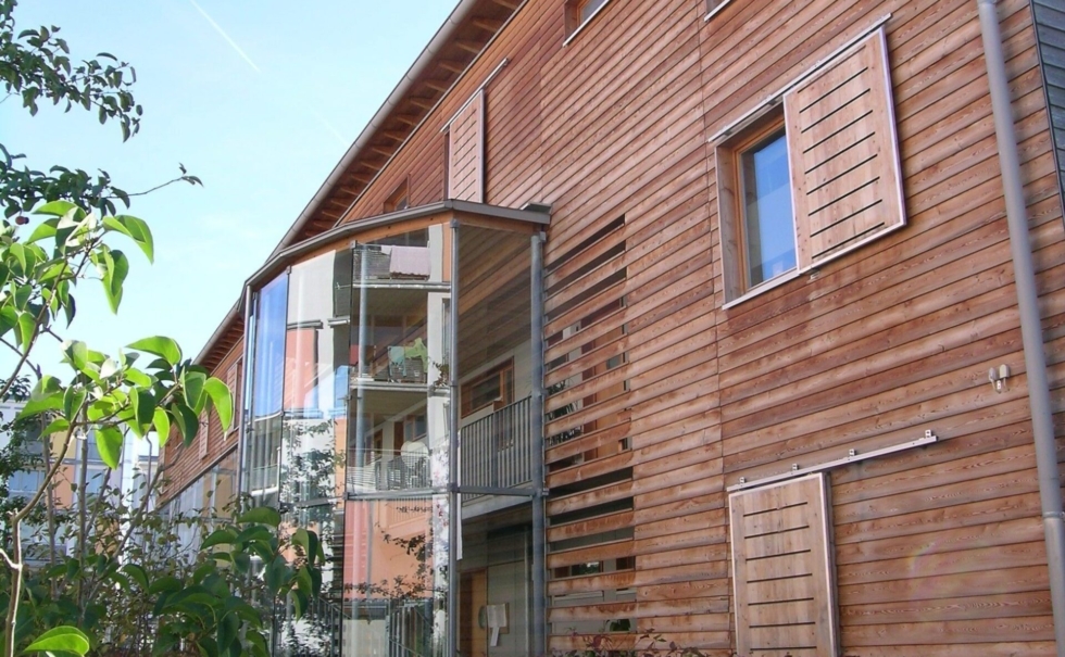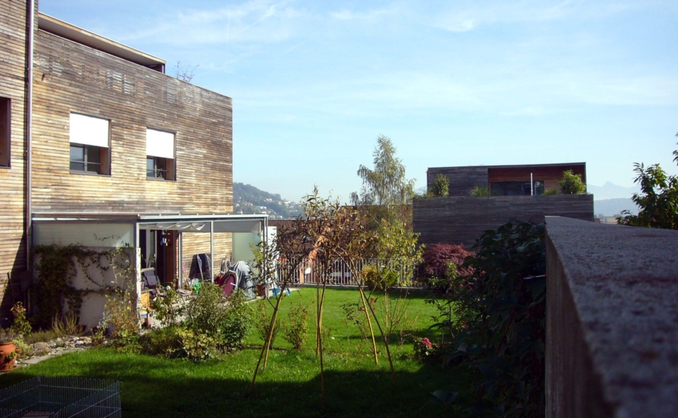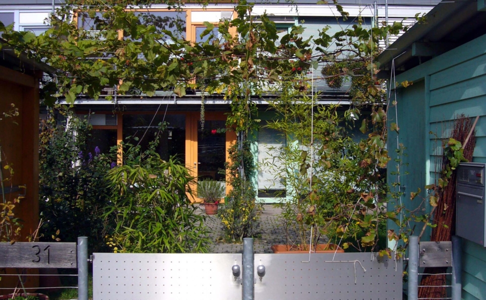 3世代以上に渡って長く住めることをテーマに、自然素材とパッシブ自然エネルギーのテラスハウス。外部は唐松のファサード、内装は漆喰にセルロース断熱材を採用。住宅を作る前の段階の建材運搬時にもトラックではなく貨物列車を使うと言うエコロジーへのこだわり。他にも雨水タンク(12000L)で雨水の活用、窓は最も断熱性、耐久性が高い木のサッシ。木を多用することでコンクリートを減らし電磁波を減らす。このエコ団地があるヴィンタートゥール地方では市が健康建材=baubiologischをリスト化しており、この団地もそのリストの中から選んだ建材だけで建てられた。
