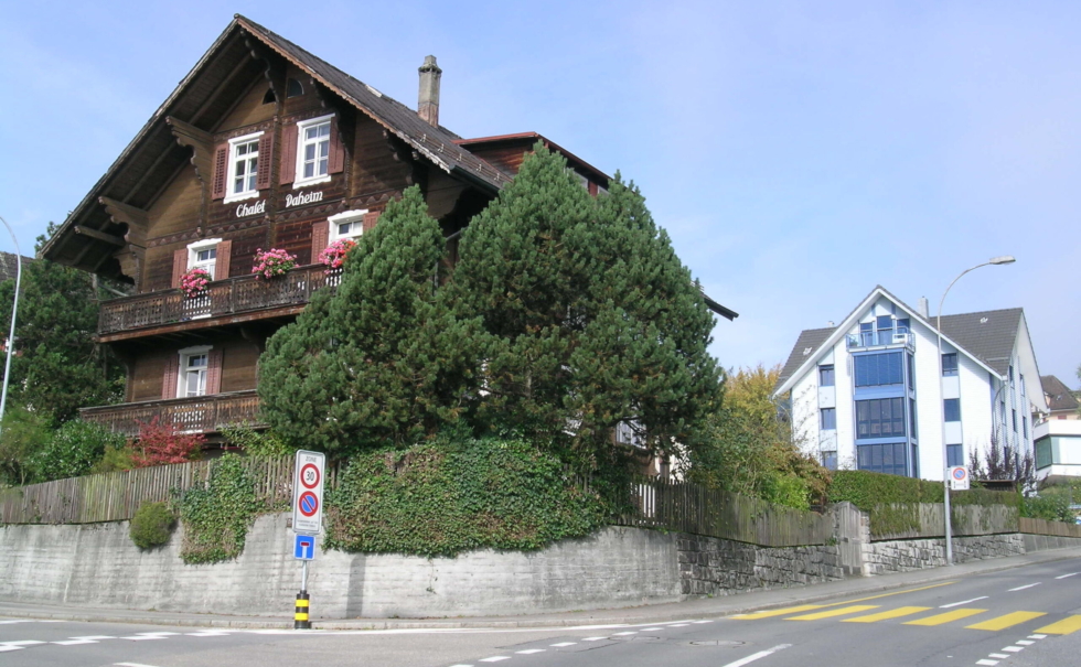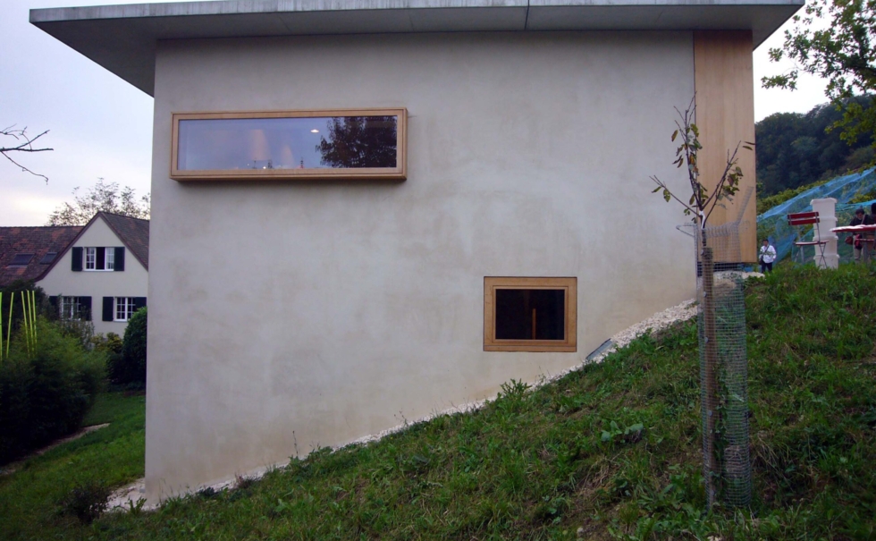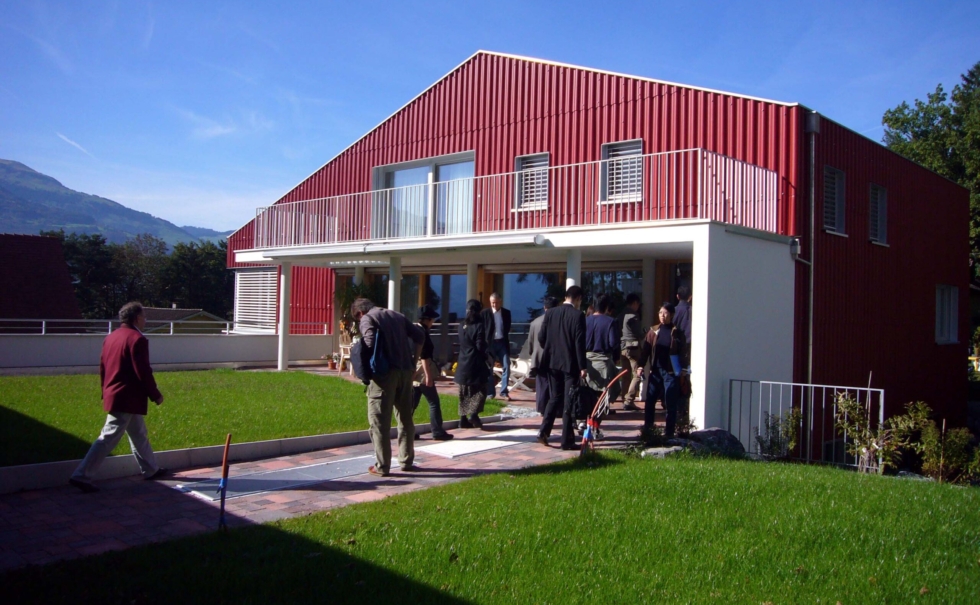 アルプスの山々をバックに建築家が自分の住居としてデザインした赤い外壁のモダンな住宅。この住宅は、モダンな外装に対して内装はスイスアルプスで産出する200年前の粘土スイスロームを使った内装。モダンとナチュラルが融合した次世代の住宅になっている。ここから500mほどのところにあるリヒテンシュタイン公国のワインセラーがあり、国王が所有する小さなぶどう畑から少量のワインが作られ、このセラーで熟成される。この希少なワインを熟成するために、余分なにおいや化学物質を分解し、一定した温度や湿度にしておくための建材としてスイス漆喰が選ばれた。