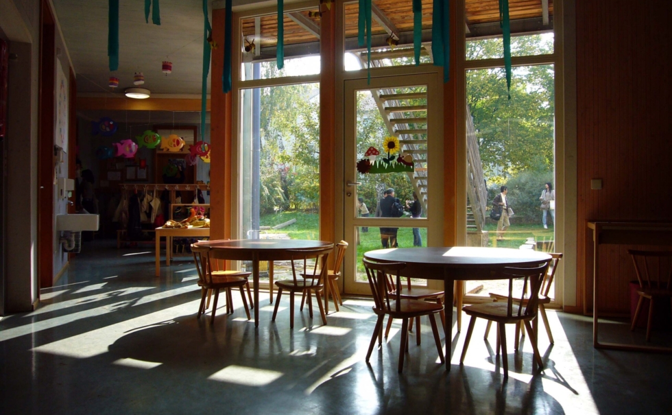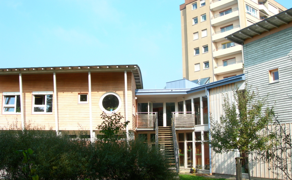 エコ建築家として有名なヨアヒム・エーブレ氏設計のこの建物は、省エネ性、社会的意義などで銀行に認められ、その融資で建てられた。そして15年後、如何にこの建築が理にかない、エネルギーを削減できる次世代の建築であるかを、実践で証明した。そんなエーブレ氏の幼稚園はエコだけではなく、建築デザインとしても優れており、園児達の元気で活発な笑顔が印象的であった。