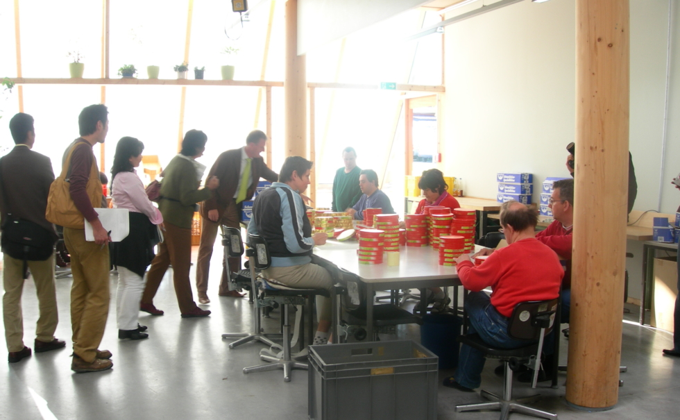 ガラスと木、そして自然から得たインテリアとエクステリアの造形が障害者の生活を精神的に豊かにし、安心してコミュニティの中で働き、生活する支えとなっている。入居者は車の部品を作ったり包装したりなどの手仕事を中心に作業し、相当な年間生産数をこなしている。この施設から「家造りとは単なる家を作ることではなく、社会を作り、暮らしを創る大きな要素だ」と言うことを教えられた。