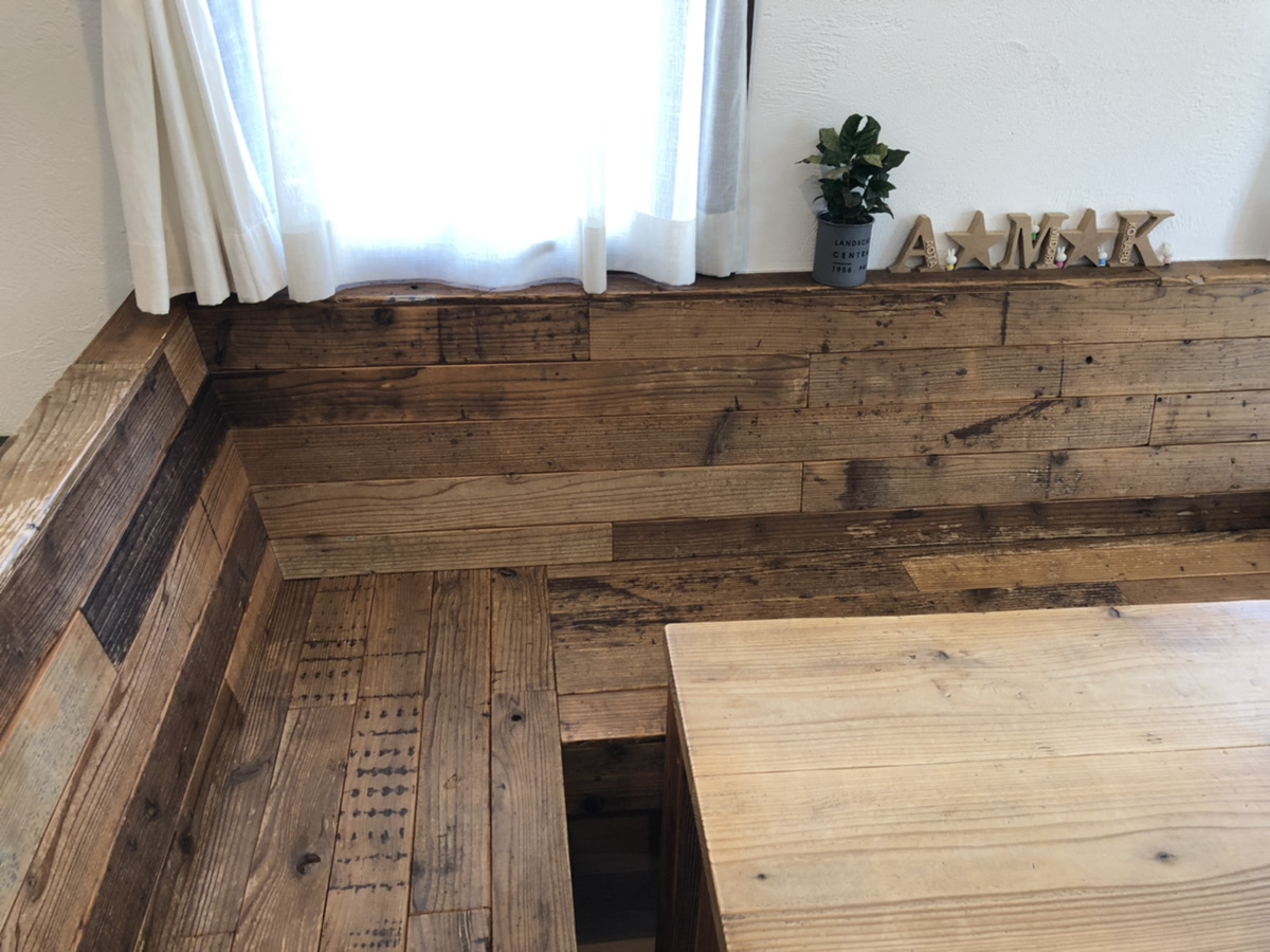 →足場板でできた、ダイニングテーブルを囲うベンチ、久しぶりのお手入れです。