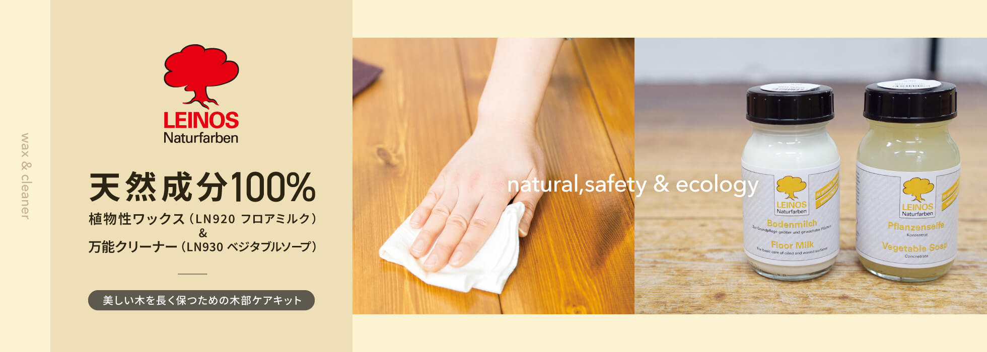 | 全成分 | 水、シェラックソープ、天然樹脂ソープ、カルナバワックス、蜜蝋、セルロース、炭酸カリウム、ベンゾイソチアゾリノン ※VOC 含有量は最大1g/ℓ(EU の制限は最大30g/ℓ) |