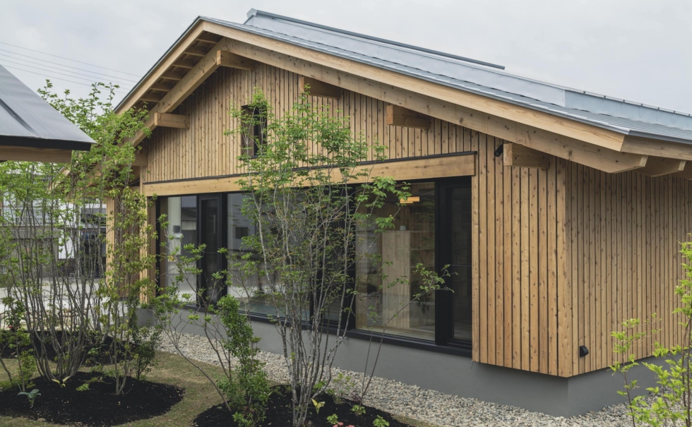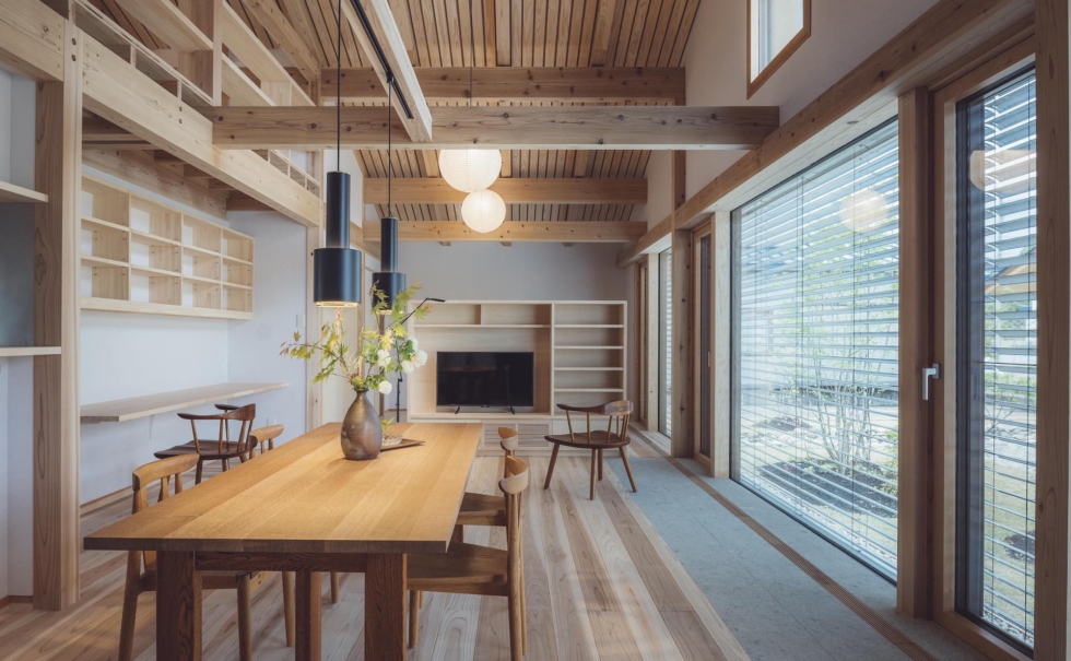 切妻の屋根形状をそのまま活かした空間は、 南側の居住スペース、北側は水廻りと収納とゾーニングされ、家具やパーテンションで仕切ることで、4.5~6帖程度の用途別の空間に分け、住み手に多岐に渡る生活の選択肢を生み出します。