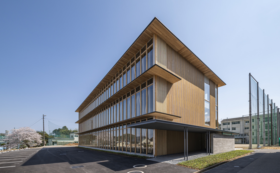 森林県日本一(森林面積No.1)である、高知県・高知市にある私立大学。 土佐桧(ヒノキ)を外壁に使用し、リボス自然健康塗料 タヤの亜麻色を採用した事例です。