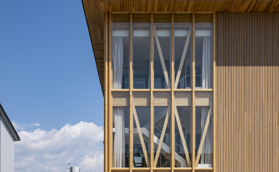 【構造】躯体:CLT工法 両壁:3X12mの日本最大の大判サイズ・3層通し壁仕様