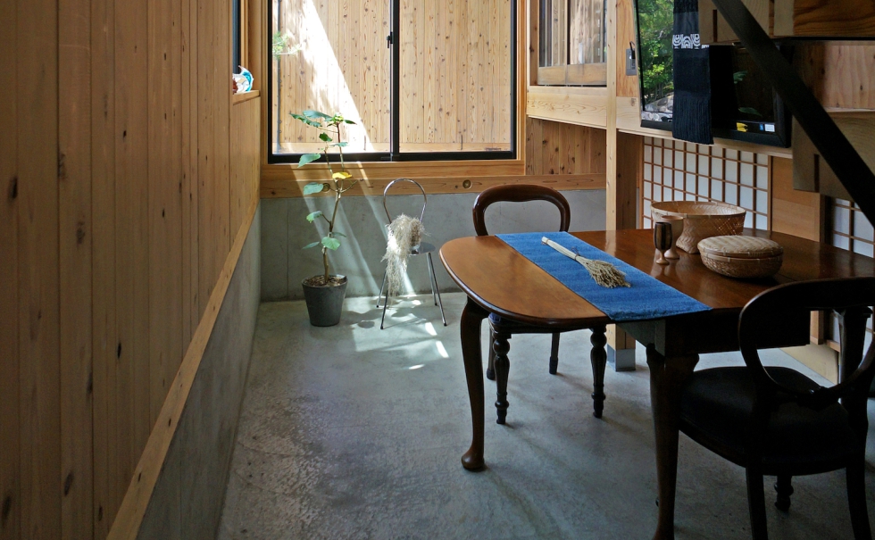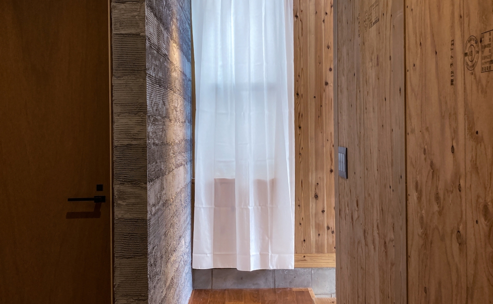 断熱材に木繊維断熱材シュタイコzell、内装のアクセントウォールにはスイス漆喰カルクウォールを着色にてお施主様がDIYで施工されています。