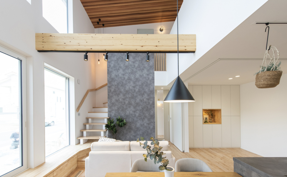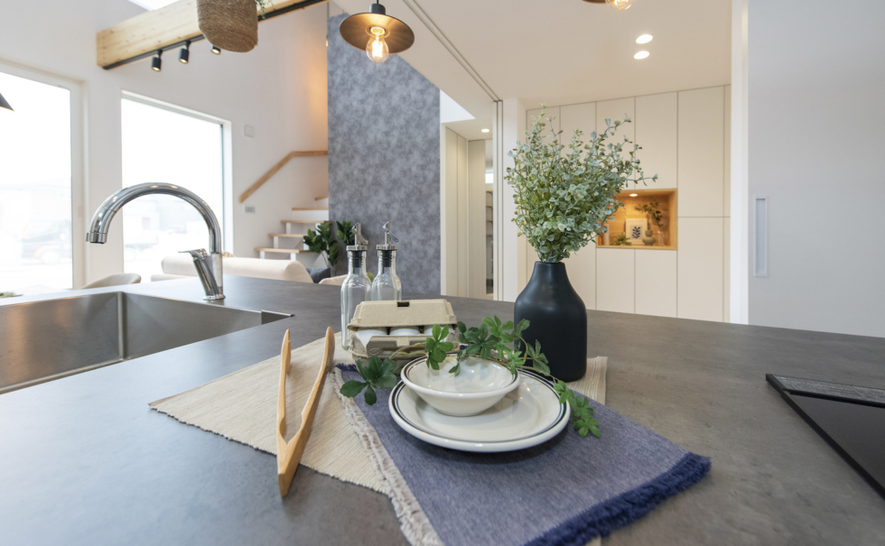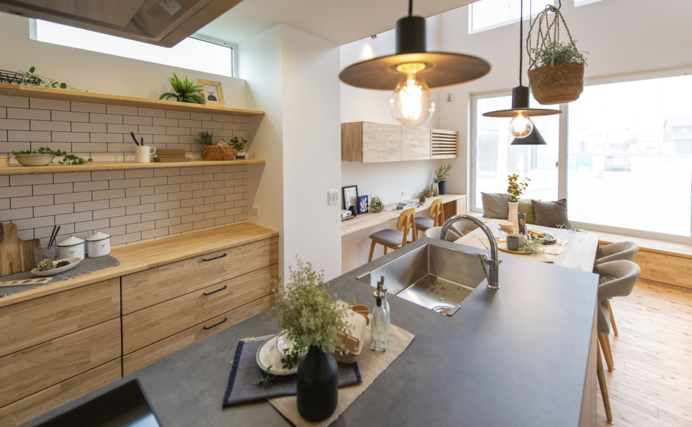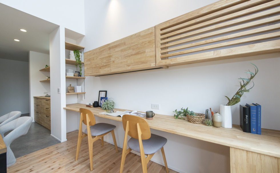木の温もりを感じられる木のニッチや、キッチン収納、スタディスペースなど、木の造作を家全体でふんだんに採用している。