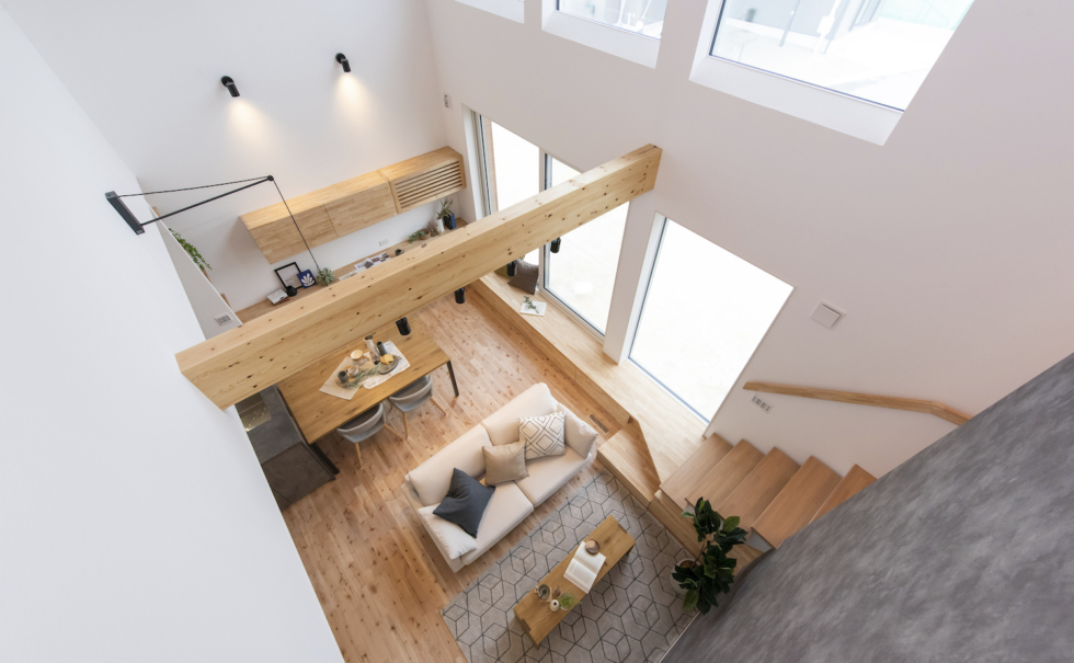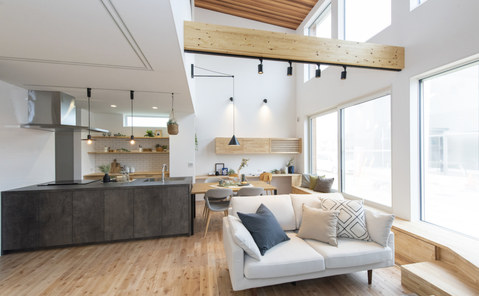 大きな開口部が上下左右に連続する、開放的な南の壁面をもつリビング空間。