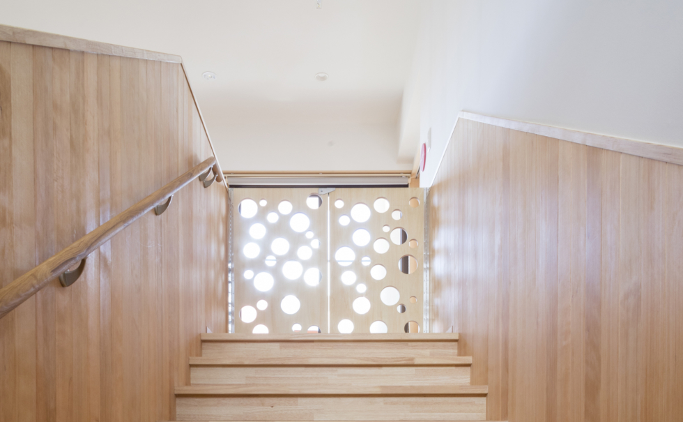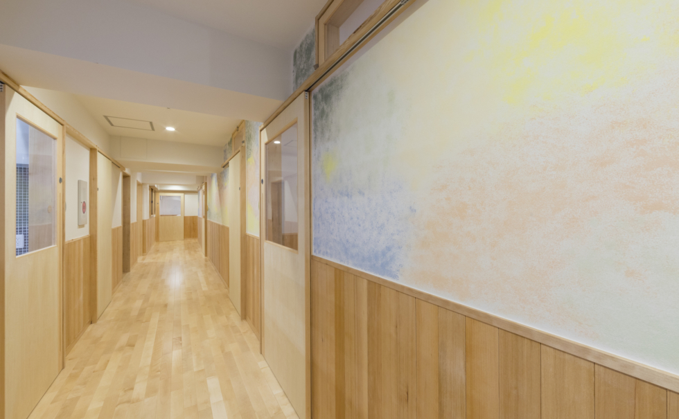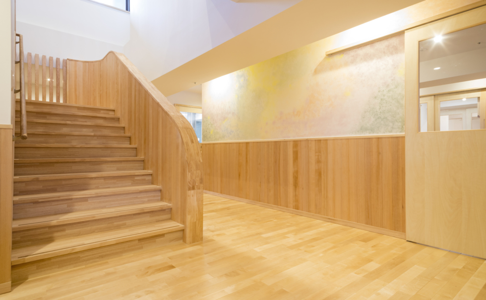 仕様 【内装】 オガファーザー M120 スムーズ リボス自然健康塗料 No.400 デュブロン アイボリー 【外装】 リボス自然健康塗料 No.244-200 クノス白木 施設:社会福祉法人信愛学園御影乳児院 写真提供:設計監理 YURI DESIGN